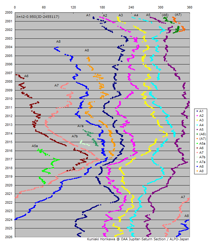 SSTB AWOの経度を、10日間毎の平均値を求めてプロットした。 Kakimoto(1980)により位相効果(d = k i)の補正を行ってある。 係数(k)は0.07を採用した。