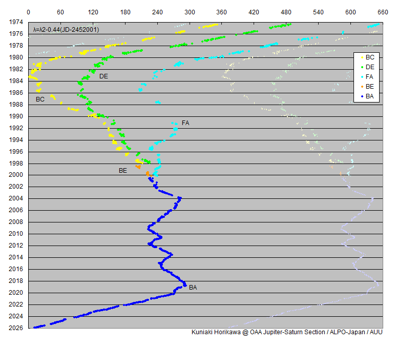 永続白斑中央の経度を、10日間毎の平均値を求めてプロットした。 FAは1987〜1991年の間、コントラスト低下によりCMTデータが得られていないので、近接していたSTB暗部のデータで代用した(位置の誤差は3〜6°と見積もられる)。