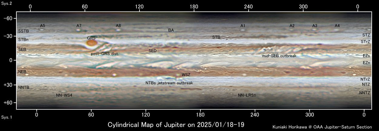 OAA木土星課への報告画像より作成。 各画像の観測日時における第2系の経度を基に展開したので、第1系の模様については、数度〜十数度の誤差がある。 使用した画像については以下のとおり(第2系の経度順)。