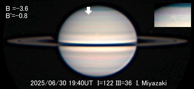 26日の宮崎氏の画像では、南半球高緯度の2本のベルトの間、南緯50°体系III=66°のSTZと思われる場所に淡い白斑が捉えられている。 同様の白斑は23日、28日、30日の画像でも見られ、測定経度が一直線上に並ぶことから、体系IIIに対して-12°/dayという高速で前進する同一の白斑と考えられる。 土星は赤道ジェットが極めて強いが、南緯50°付近にも+100m/sを越える大きなピークがあり、白斑はこのジェットストリームに乗っているらしい。