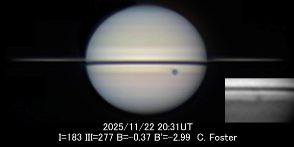 残念ながら日本では見ることができなかったが、22日に最大の衛星タイタンの土星面経過があった。 興味深いのはFoster氏のメタンバンド画像で、経過中のタイタンが黒丸として見られる。 衛星は土星大気圏外にあるので、通常は明るく輝くが、タイタンはメタンの大気を持つため、吸収が働き暗く写る。 タイタンだけで見られる珍現象である。