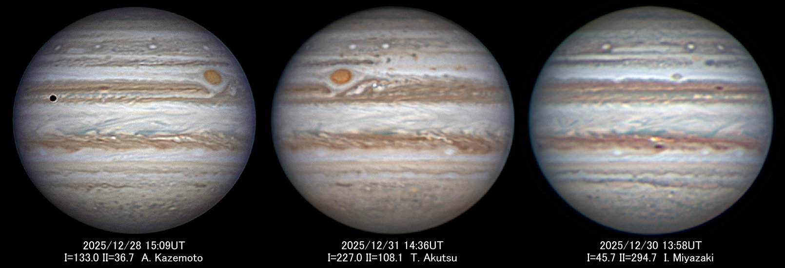 | 左) SSTBにAWOが並び(A3〜A5とA7)、NEBでは活発なリフト領域が見られる。STrBは大赤斑の直前では濃いが、前方では淡い。エウロパの影が経過中。中央) 大赤斑後方のSEBでは小規模ながら白雲活動が続いている。NEB北縁の白斑はWSZ。右) STrZの大きなリング模様。STBの切れ間に永続白斑BAがある。 |