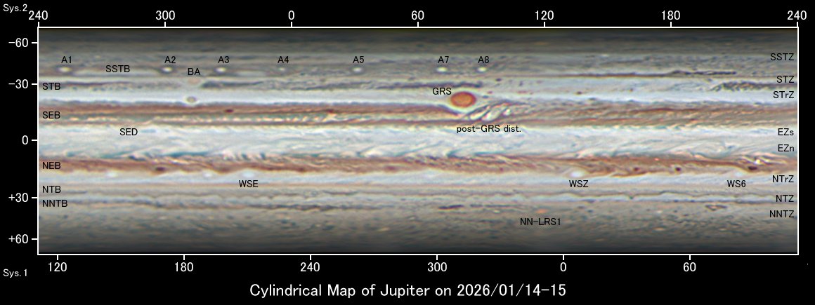 | 宮崎氏による2026年1月14〜15日の6画像から作成。RS後方に白雲の活動領域(post-GRS dist.)が復活している。 |