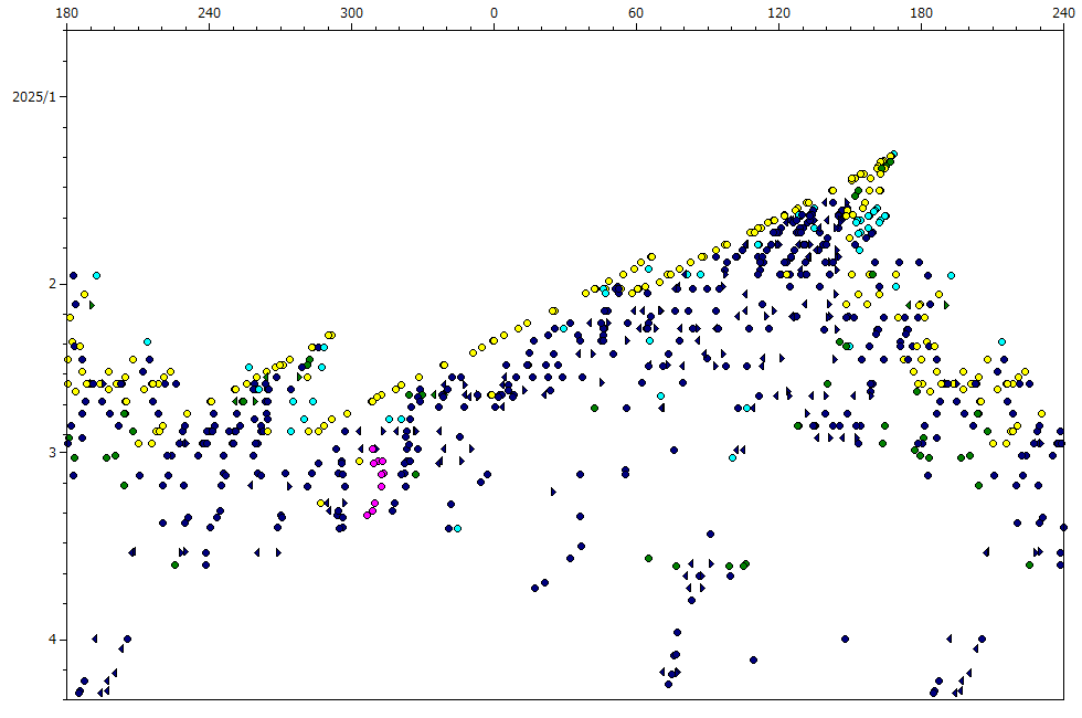 | No. | Date | Time | Longitude | Sys. | PCF | Object | Location | Latitude | Observer | Est. Longitude | Error |